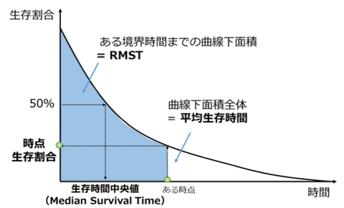 こうした背景から注目されているのが、RMST(Restricted Mean Survival Time:制限付き平均生存時間)です。