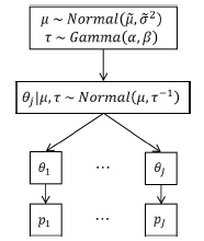 \[f(\boldsymbol{\theta},\mu,\tau|\boldsymbol{n},\boldsymbol{r};j=1,…,J)=\left[\prod_{j=1}^{J}L(\theta_j|n_j,r_j)f(\theta_j|\mu,\tau)\right]f(\mu| \tilde{\mu},\tilde{\sigma}^{2})f(\tau|\alpha,\beta)\]