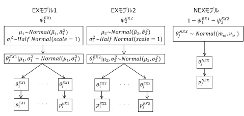 部分集団 j の奏効確率に対して、確率 \(\pi _j\) でEX分布、確率 \(1-\pi _j\) でNEX分布を仮定します。