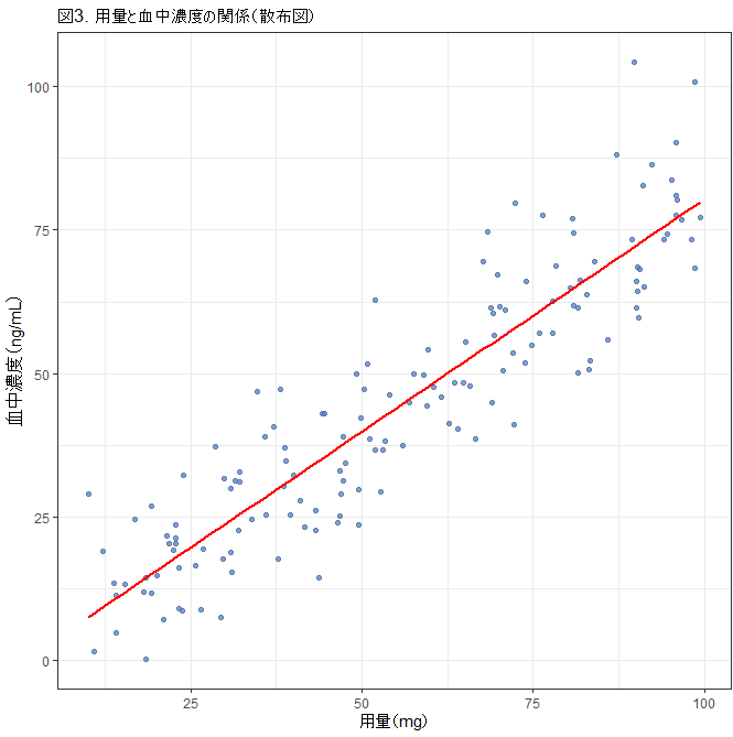 title = “図3. 用量と血中濃度の関係(散布図)”,