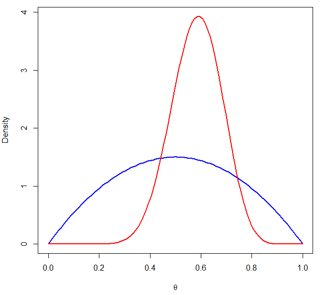 plot(theta, prior, type=”l”, col=”blue”, lwd=2, ylim=c(0, max(posterior)),