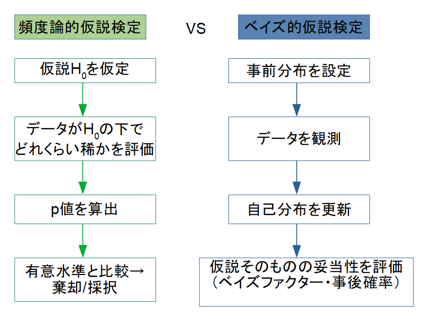 ベイズ統計では、パラメータを確率変数とみなし、事前分布を設定します。データを観測した後、事後分布を更新し、仮説の妥当性を直接評価します。