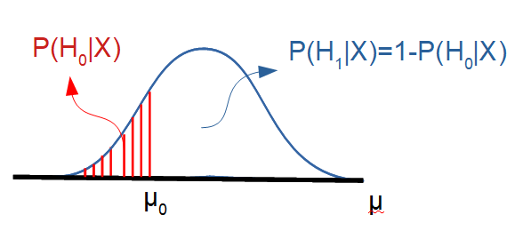 データxが得られる確率を、\(\mu\)の値によって評価していきます。データxが与えられた下で、仮説を満たす確率\(P(H_{i}|X)\)が得られます。