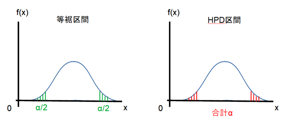 事後分布の両端を同じ確率で切り落とす。 - 最高事後密度区間(HPD: Highest Posterior Density interval)