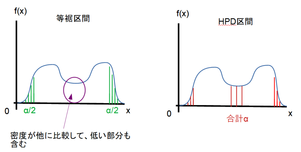 密度が異なる分布:密度が異なる分布では、HPD区間では、密度が高い部分を選び、区間とします。そのため、パラメータの真値である可能性が高い区間という意味でHPD区間のほうが、適切を考えられます。