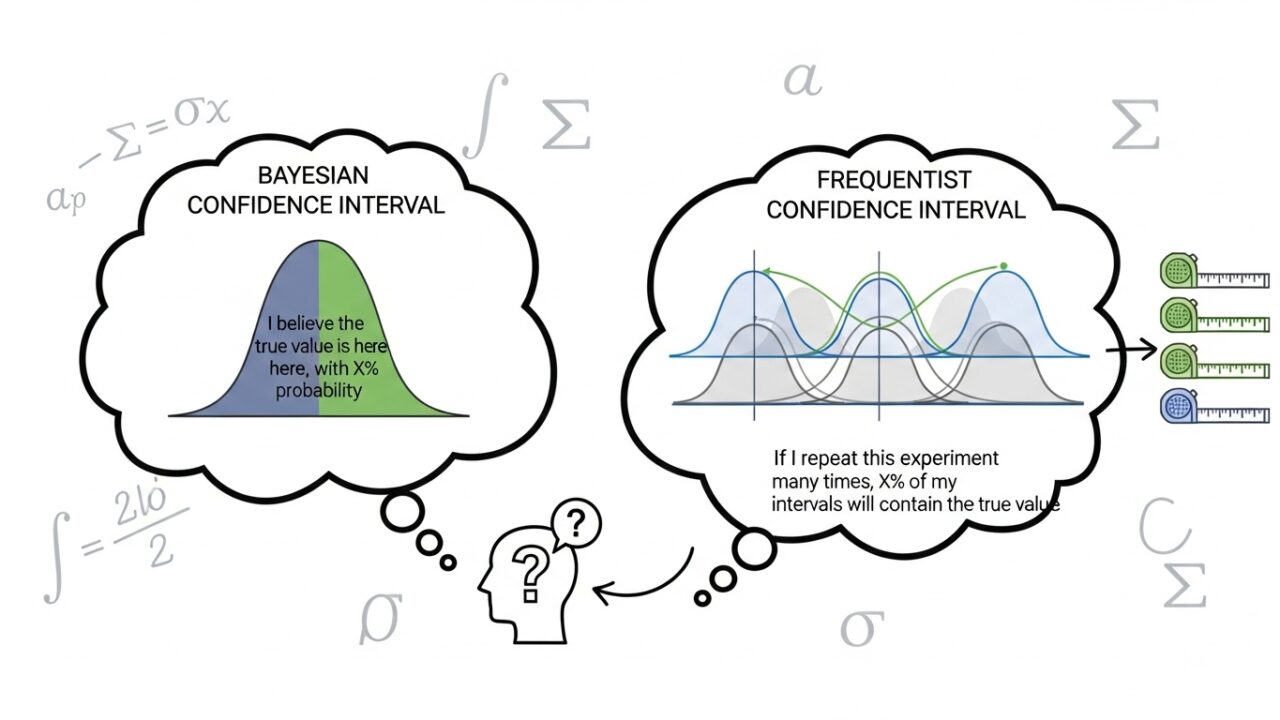区間推定における頻度論とベイズ統計の違いは、母数の扱い方と区間の解釈に根本的な差があります。頻度論的な信頼区間は「推定方法の性質」を保証するものであり、無限に標本を繰り返したときに一定割合の区間が真の母数を含むことを意味します。一方で、ベイズ的な信用区間は事後分布に基づき「母数がその区間に含まれる確率」を直接表現できるため、より直感的で意思決定に活用しやすい特徴があります。