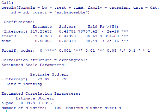fit_ar1 <- geeglm(bp ~ treat + time, id=id, data=dat,