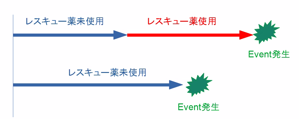 例えば、新治療薬に効果があるかを検討する臨床試験を想定します。そこで、レスキュー薬を使用しているか使用していないかでアウトカムに影響が出るような共変量がそれに該当します。下記の例だとレスキュー薬を使用した時のほうがEvent発生が遅くなるため、アウトカムに影響が出ていると判断できます。