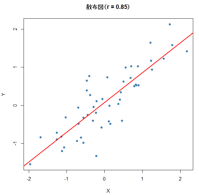- r>0:片方が大きいほどもう片方も大きくなる(正の相関)