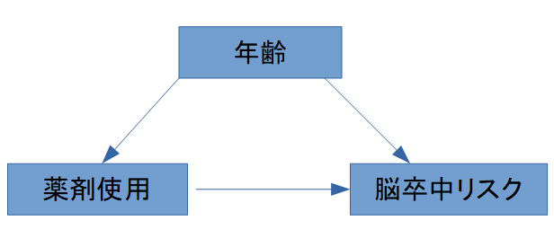 - 年齢は薬剤投与の有無に影響し、同時に脳卒中リスクにも影響する。