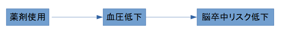 例:薬剤投与 → 血圧低下(中間因子) → 脳卒中リスク低下。