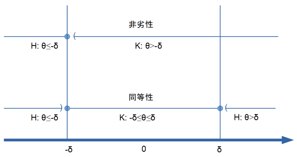非劣性試験、同等性試験を図式にすると以下のようになります。